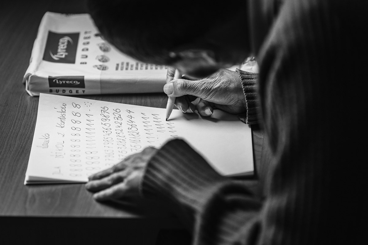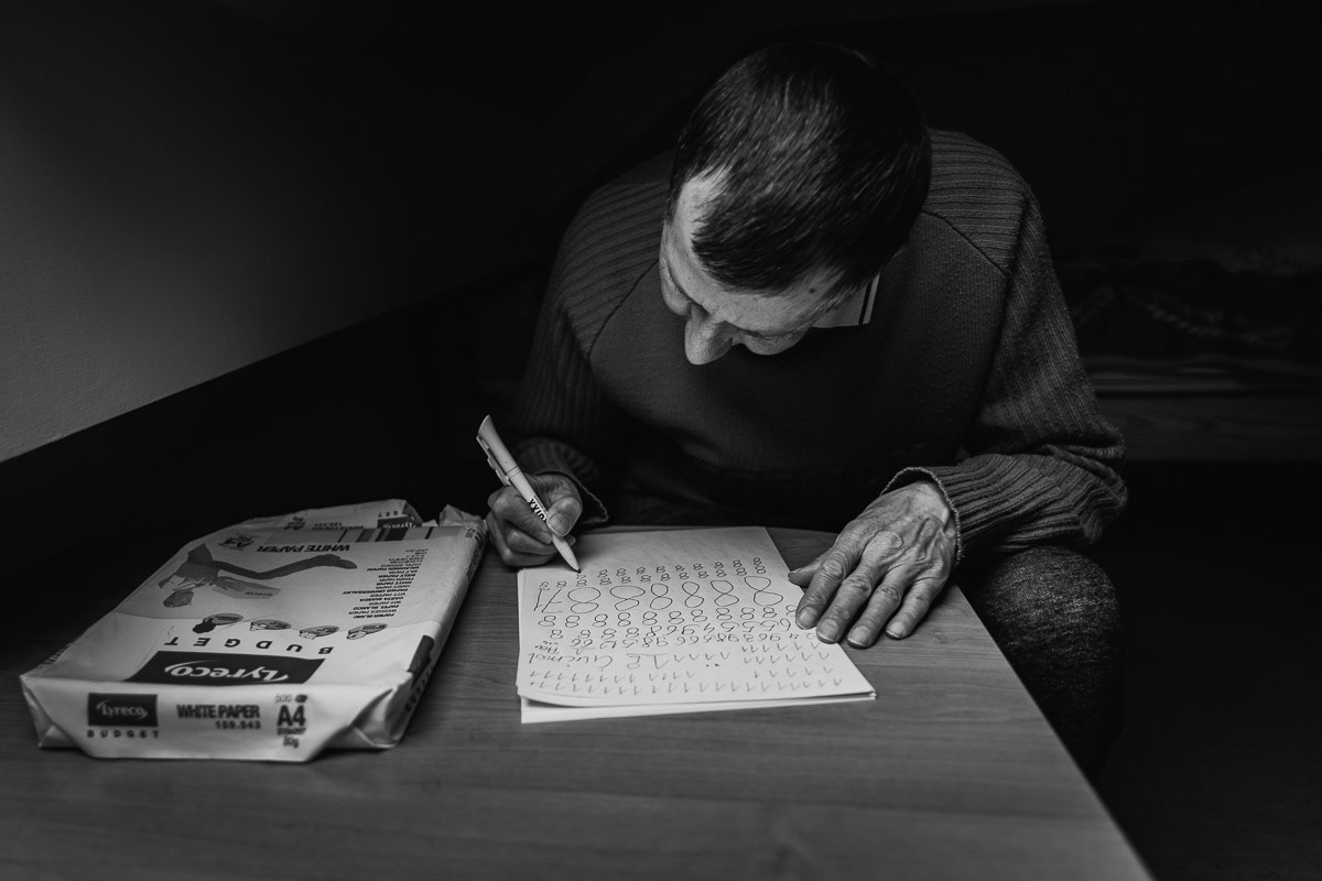 ‘Everyday is another struggle to make someone leave the bed, where they’d preferably linger looking at the ceiling,’ Tadeusz says. Here, one of the residents is photographed solving memory-flexing exercises with the psychologist's help.