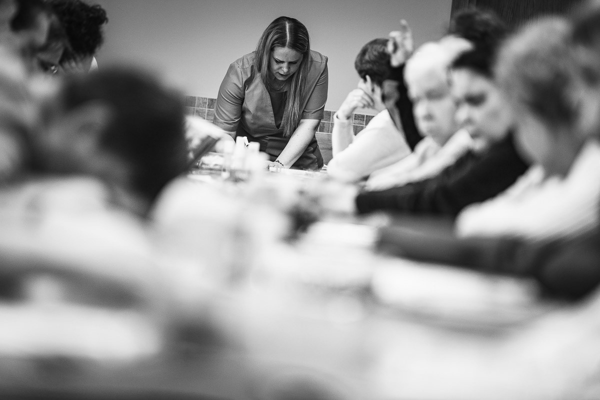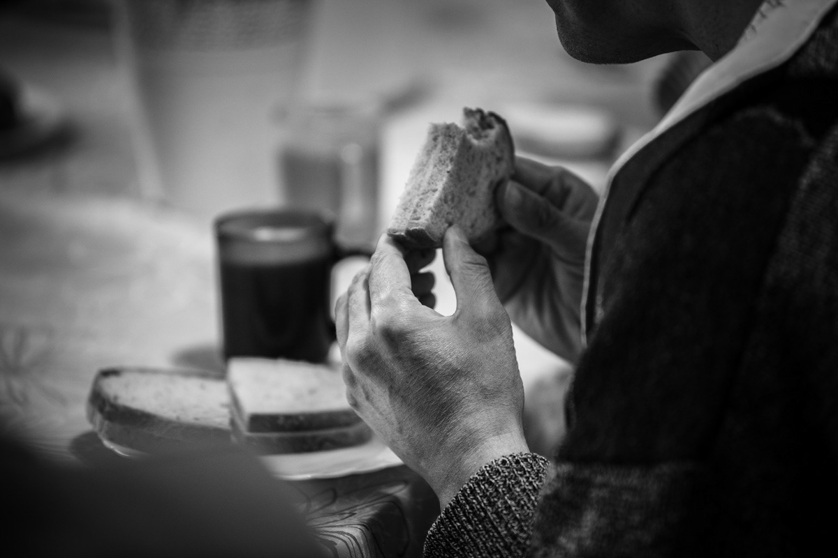 The breakfast, 8:00 AM. The residents gather at the small tables in the common-room, the caretakers prepare the meal. With a few brief exceptions, the wait as well as the meal continues in silence.