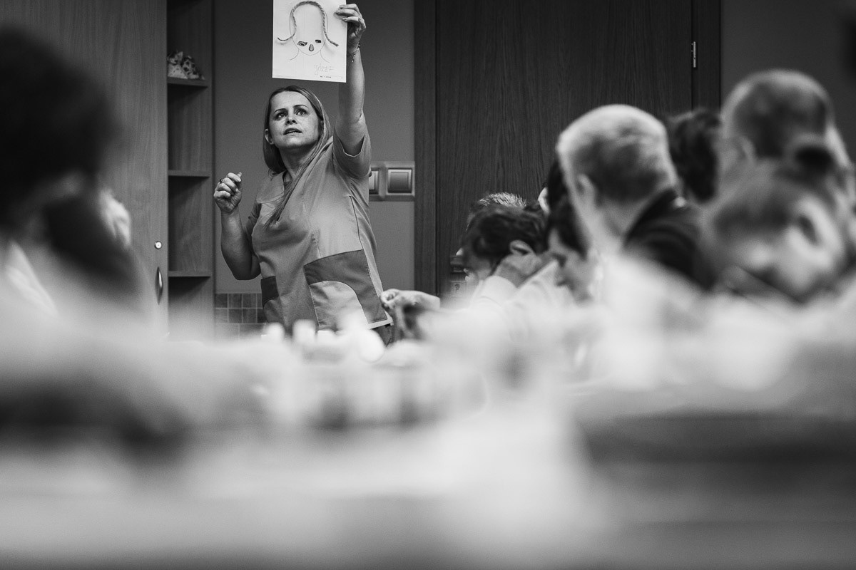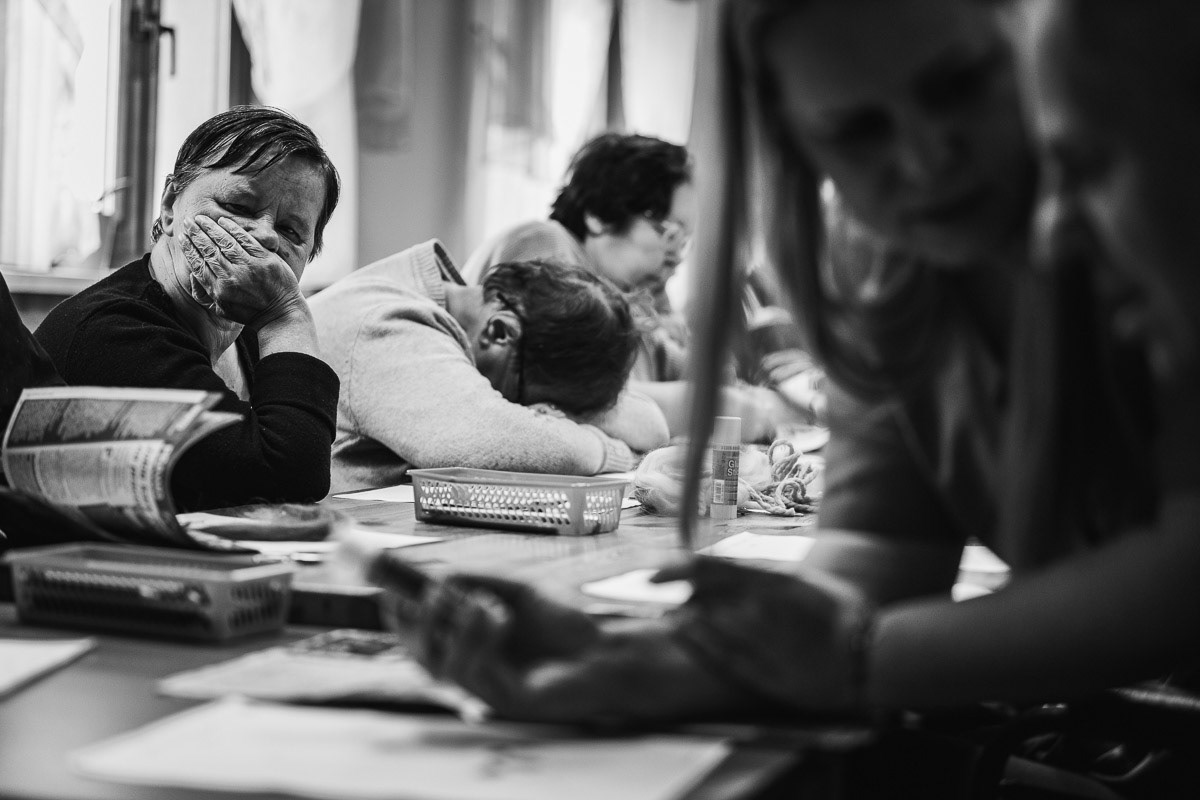 With the paintings and needle-work by the residents behind her, Małgorzata—one of the caretakers with twenty years of experience explains the importance of enticing the residents to leave their rooms and take part in collective activities. ‘The residents can’t be forced to partake,’ she says ‘yet, a prolonged period of inactivity causes their condition to deteriorate.’
