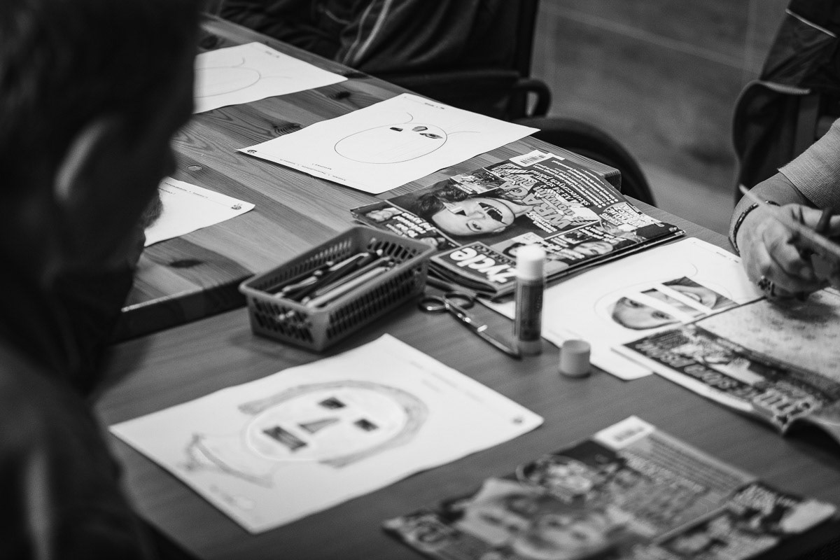 Fine art assignment—creating a face-collage out of magazine cut-outs. The medicine-induced torpor doesn’t help the creative process. Many residents lacking the manual skills are helped by the instructor. Eventually, the best works get due praise and acclaim.