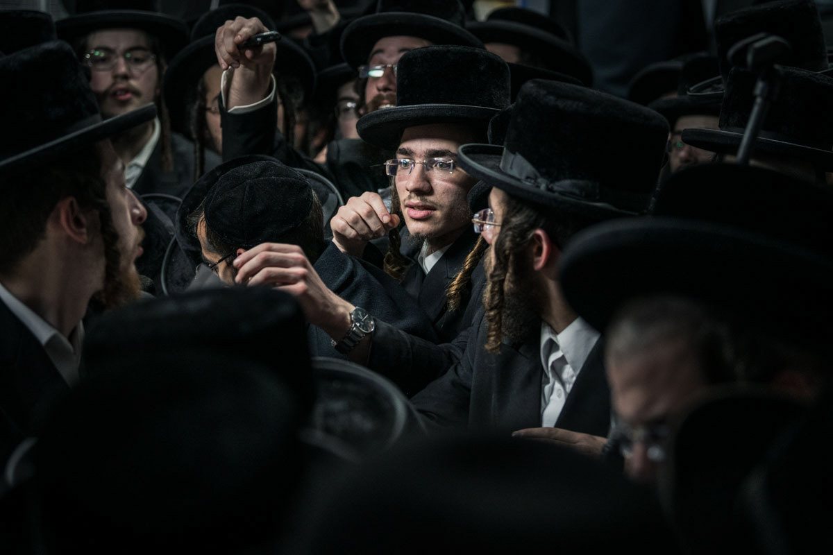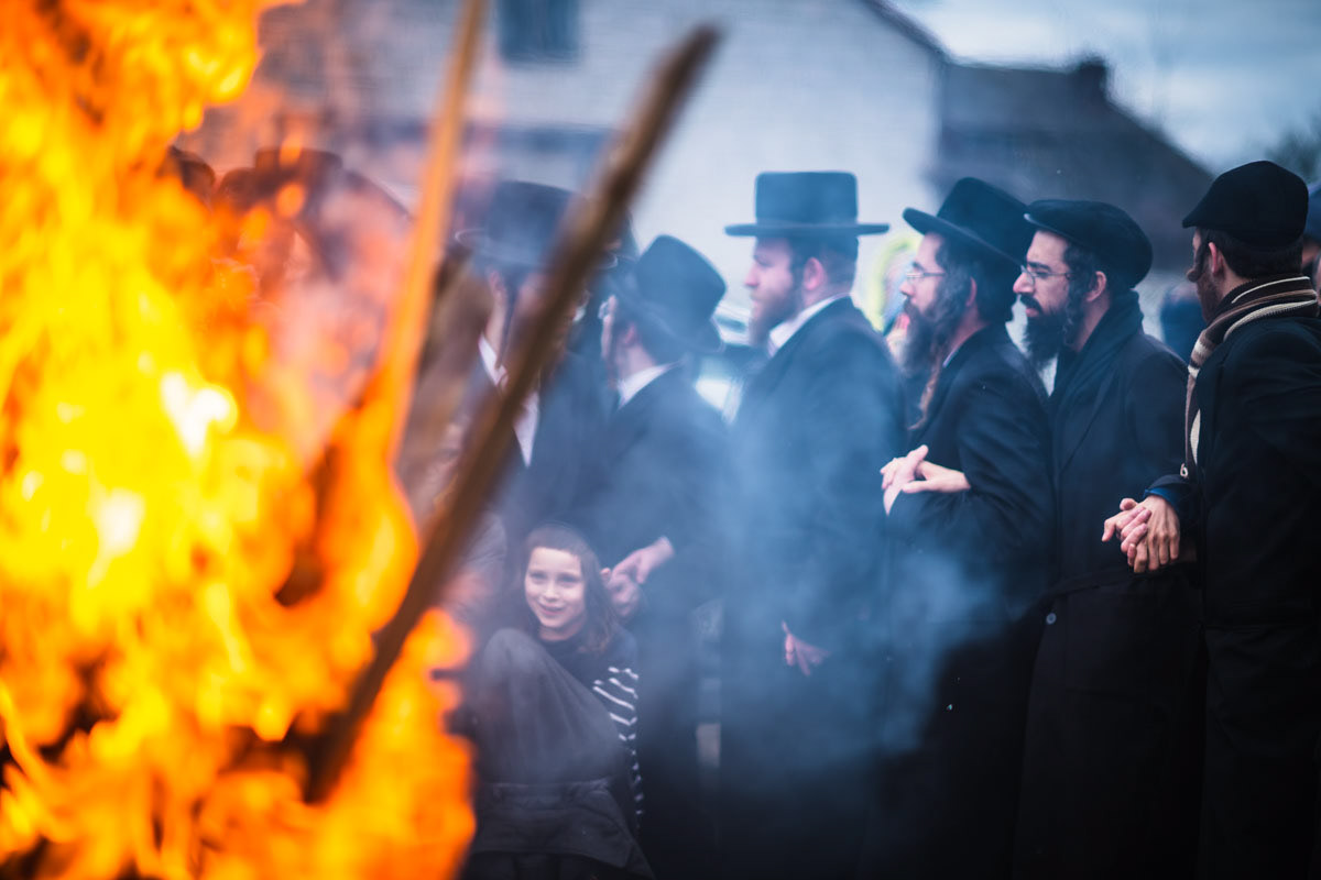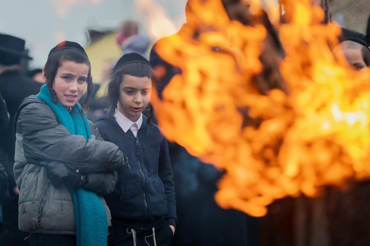 The prayers at the tomb are followed by the commemorative fire outside. Dancing and cheering, the Hassidim pour oil into the flaming barrel as the local firemen stand in a distance, recording the scene on their mobiles.