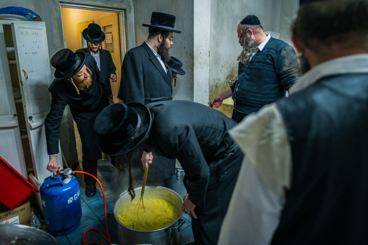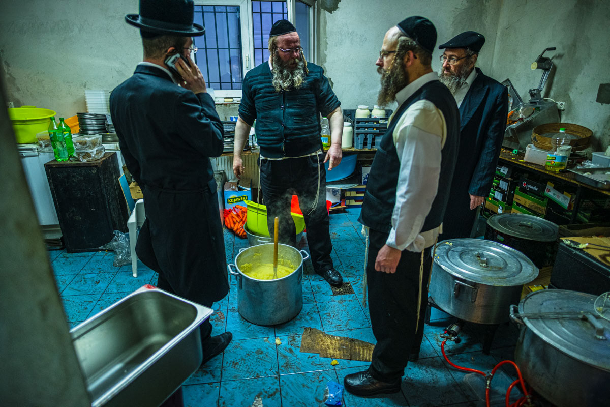 The kitchen resembles a train station: the Hassidim get in and out quickly through the second exit. Everybody knows better and everybody makes sure his input is heard and appreciated by the ever-patient Mashgiachs.